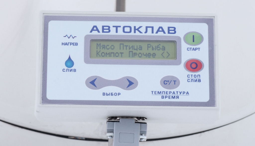 Электрический автоклав из нержавеющей стали с полностью автоматизированным процессом стерилизации. Оснащен электрическим блоком управления (ЭБУ) с возможностью стерилизации в 4 автоматических режимах "Мясо", "Птица", "Рыба", "Компот". В автоклаве предусмотрены автоматические режимы для жестяных банок и реторт-пакетов. Есть возможность сохранения до 10 собственных программ стерилизации для каждого вида упаковки.